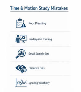 | 4. Ignoring Operator Performance Rating | Record raw time without rating | Produces unrealistic standards | Apply performance rating & normalize time |