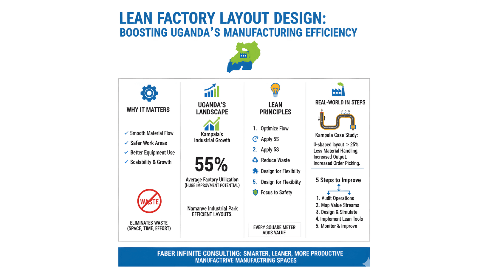 Industrial zones like Kampala Industrial and Business Park (Namanve) are now prioritizing efficient plant layouts and lean facility planning to help manufacturers cut costs and improve flow — a direction that aligns perfectly with global lean standards.