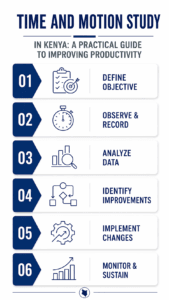 It forms the backbone of lean time and motion study in Kenya, helping organizations achieve productivity improvement, cost reduction, and sustainable continuous improvement.